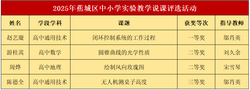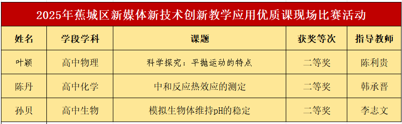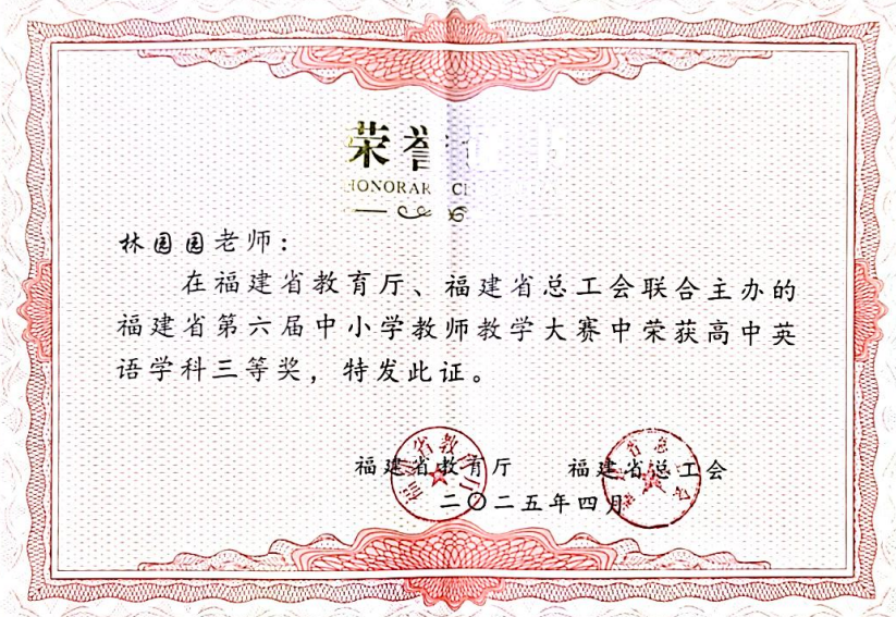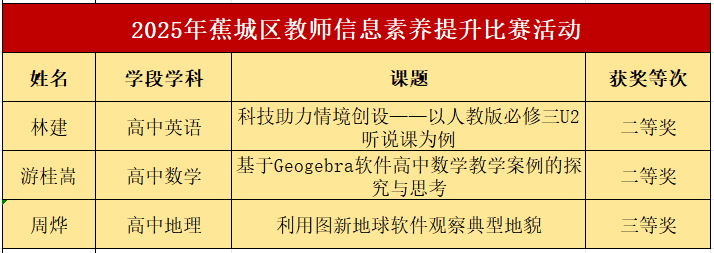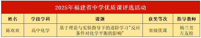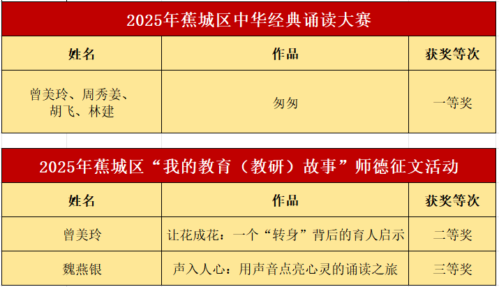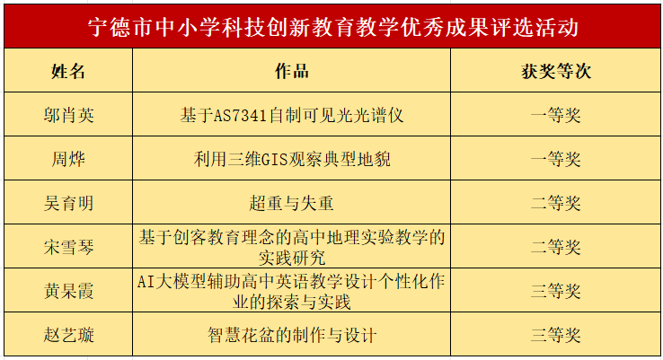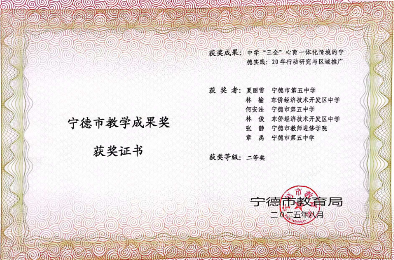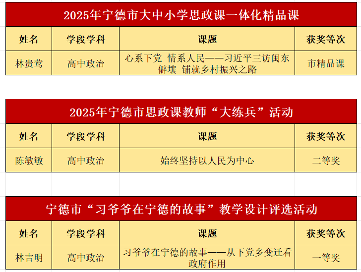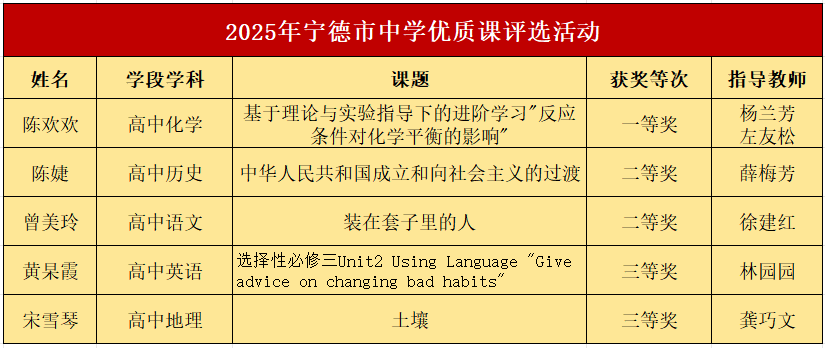 时光荏苒,硕果盈枝。学校持续深化“青蓝帮带”机制,着力加强教师队伍建设。全体教师凝心聚力、团结协作,在各级教学竞赛与专业评比中屡创佳绩,充分展现出卓越的团队实力与昂扬向上的精神风貌。 2025年,我校教师在省、市级各类比赛中累计获奖54人次,成果丰硕。其中包括省教师教学大赛三等奖1人、省级精品课2节、省级优质课1节、市级精品课5节;市级一等奖6人、二等奖6人、三等奖5人;区级获奖25人次。何安法、夏丽雪、章禹三位教师荣获市级教学成果奖。 福建省第六届中小学教师教学大赛 宁德市2025年教学成果奖 福建省2025年“基础教育精品课”活动 省级精品课 旧岁已展千重锦,新年再进百尺竿。谨此向辛勤付出的全体师生、关心支持的家长与社会各界致以衷心感谢!新征程上,我校将继续砥砺前行,共创更加辉煌的明天! 编辑:教研室 初审:陈爱星 颜元智 终审:何安法 陈再发