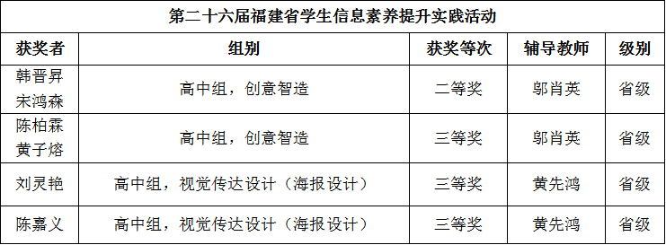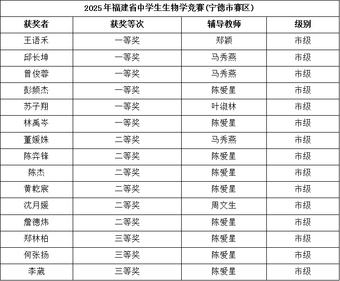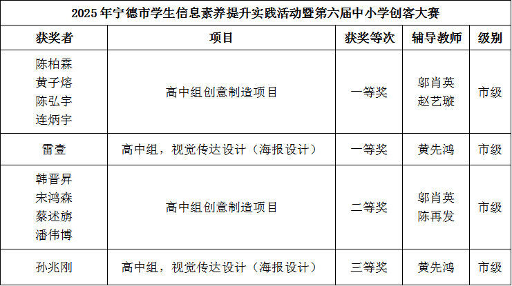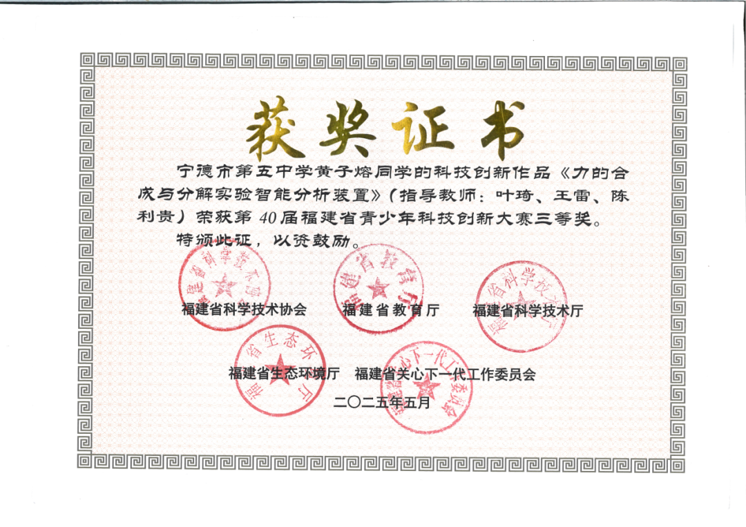 奋进五中学子,荣耀2025 宁德五中年度硕果盈枝 时光如流,嘉木成林。2025年,宁德五中全体学子勤学笃行、锐意进取,在省、市、区各级比赛中喜报频传,成绩斐然,共获奖156人次,其中省级获奖16人次,市级获奖46人次,区级获奖94人次。学子们在科技创新、学科竞赛、文体艺术等多个领域屡获殊荣,充分展现了五中学子扎实的学识素养与蓬勃向上的青春姿态,以实际表现为学校赢得了广泛赞誉。 科创领域:科创学子捷报迭传,2025年再创辉煌,稳居获奖主力,斩获省市区多级奖项。 学科赛场:五中学子深耕不辍,以严谨为基、思辨为刃,凭扎实学识攻坚克难,屡创佳绩。 体育赛场:体育健儿热血拼搏,田径足球等项目全面开花,用汗水诠释体育精神,尽显少年朝气。 旧岁已织锦绣篇,新年更攀凌云峰。谨此向勤奋拼搏的全体同学、悉心教导的老师们以及一直关心支持学校发展的家长与社会各界,致以诚挚的感谢!新征程上,宁德五中将继续秉持育人初心,携手并肩,共同谱写更加灿烂的明天! 供稿:教务处 编辑:教务处 初审:陈爱星 颜元智 终审:何安法 陈再发